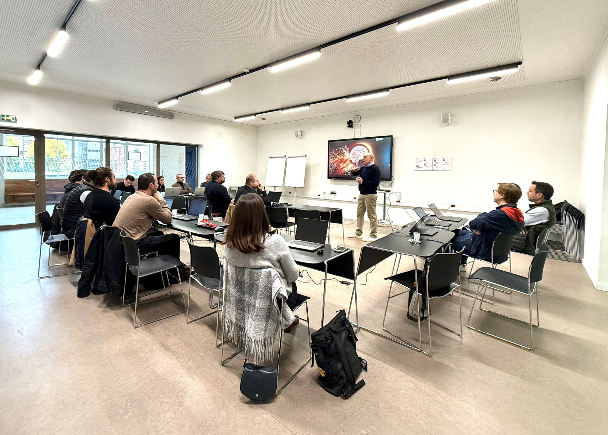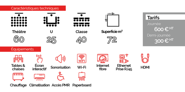 Ces 2 salles de 72m2 sont idéales pour une petite conférence, un workshop, une réunion ou une formation. Tout l’équipement est fourni : tables, chaises, écran interactif.